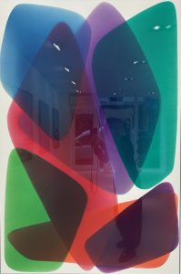 Through large paintings made with epoxy, coloured and transparent layers overlap to bring forth transparency, reflections, and chromatic vibrations.