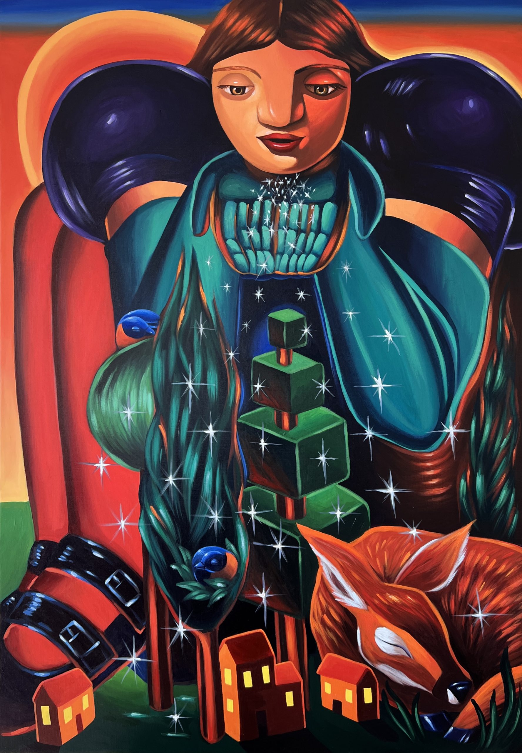Sometimes islands, sometimes mountains, Annabel’s giant and colorful women, inspired by Niki de Saint Phalle sculptures, build et protect the lanscape under the approval of tiny birds and butterflies. Annabel Loves playing with scales, creating complex macrosm and miscrosm to invite the spectator to discover plenty of details while they are approching the painting.