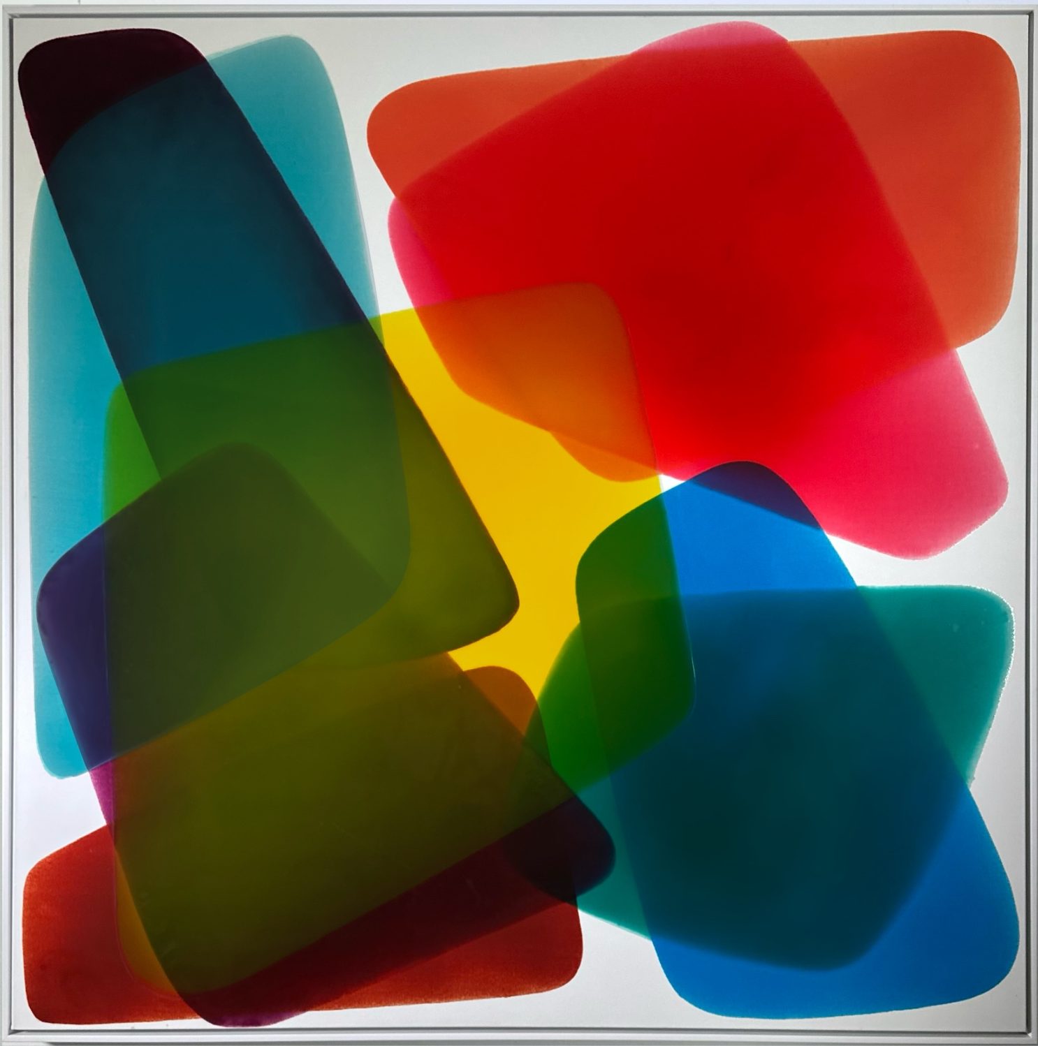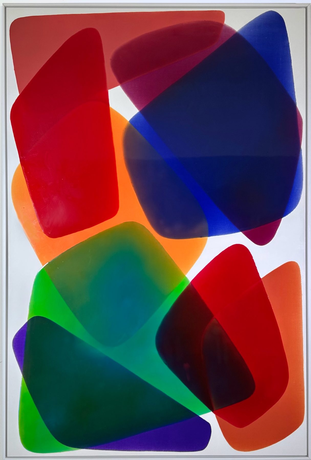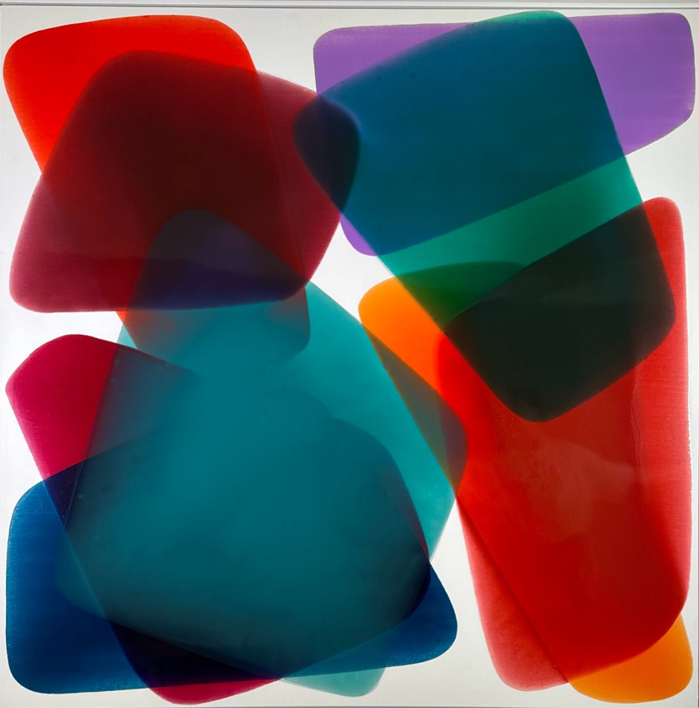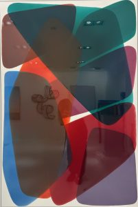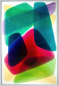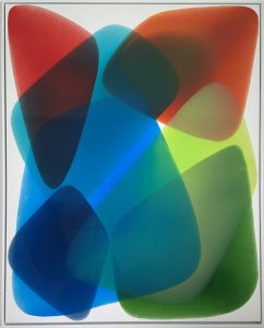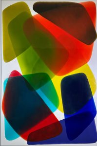 Through large paintings made with epoxy, coloured and transparent layers overlap to bring forth transparency, reflections, and chromatic vibrations.